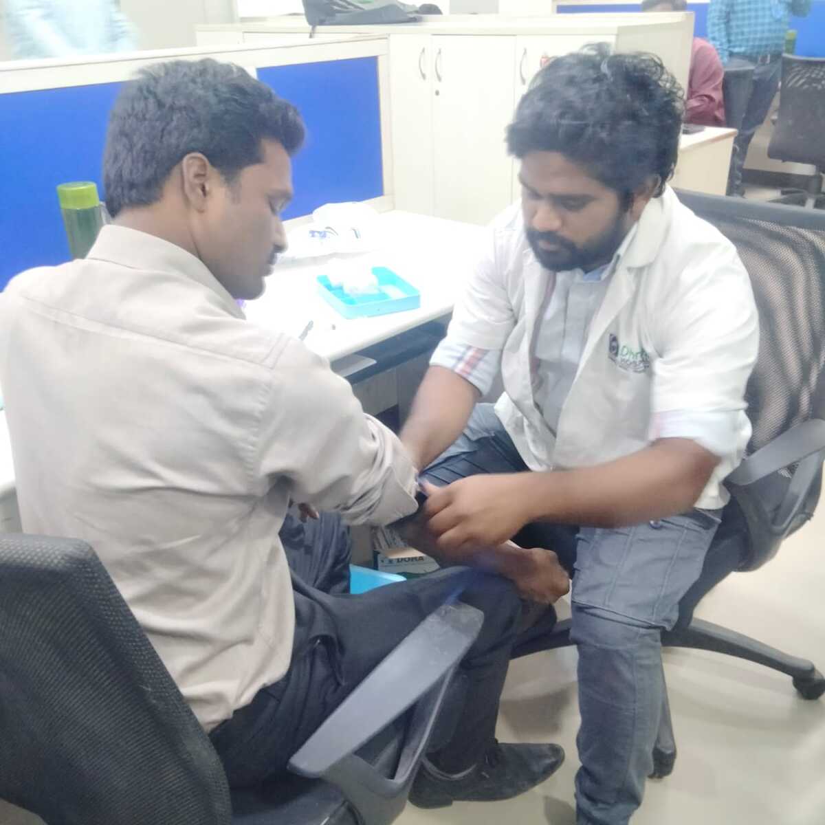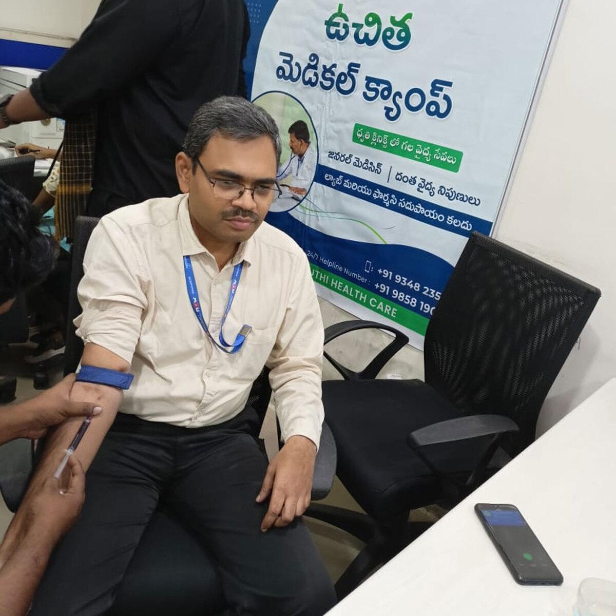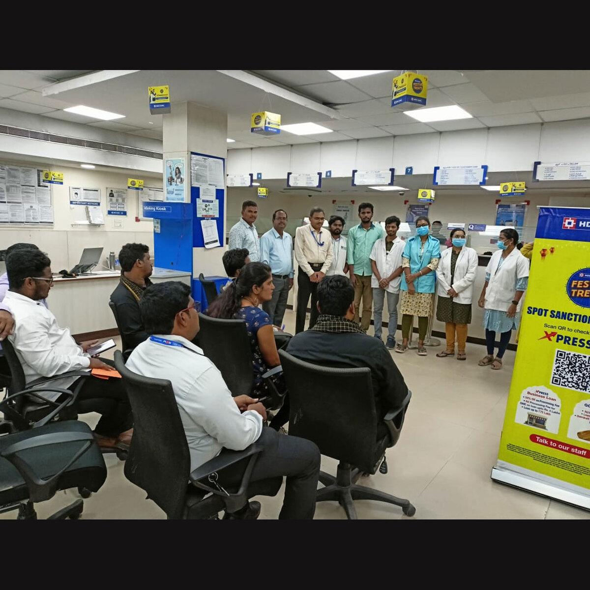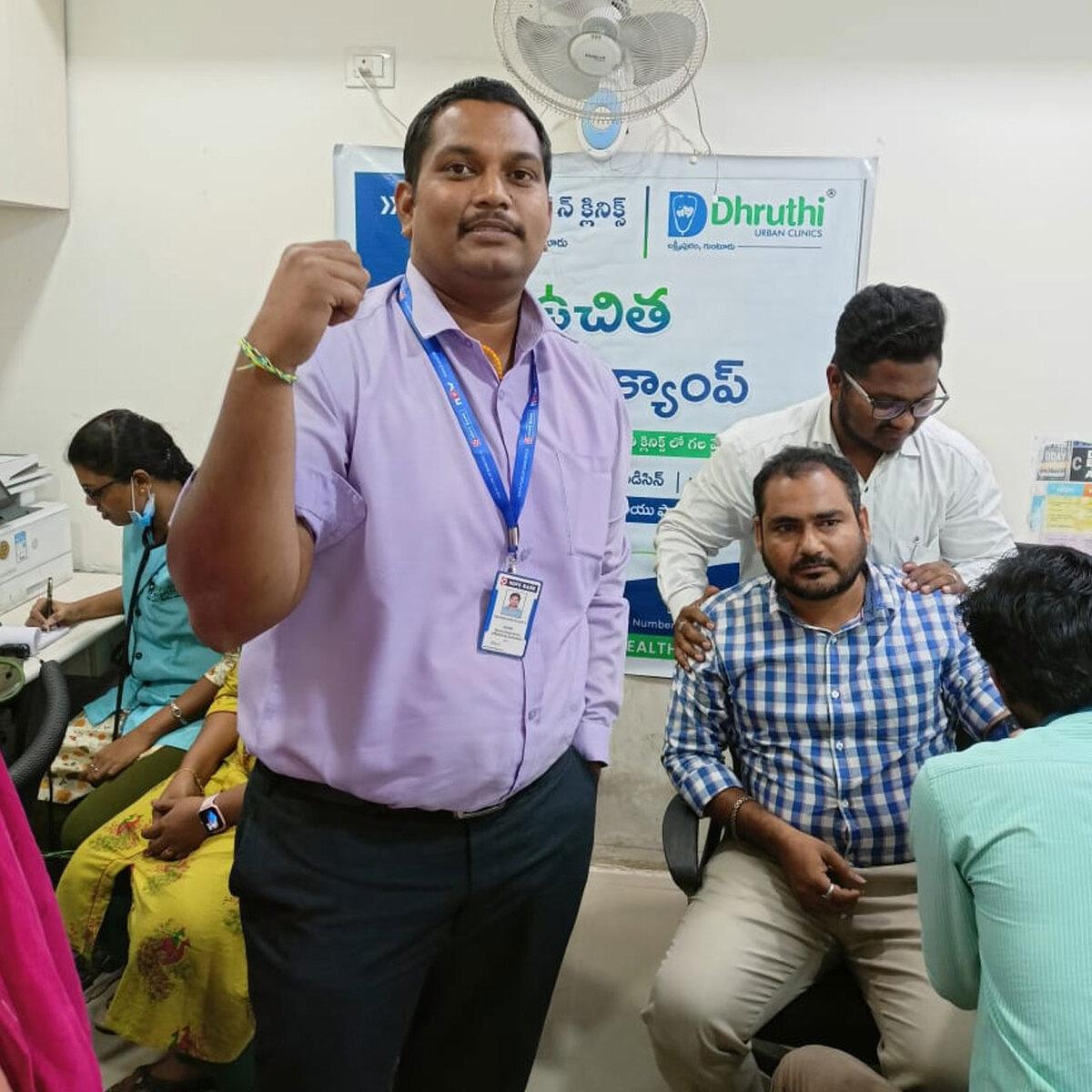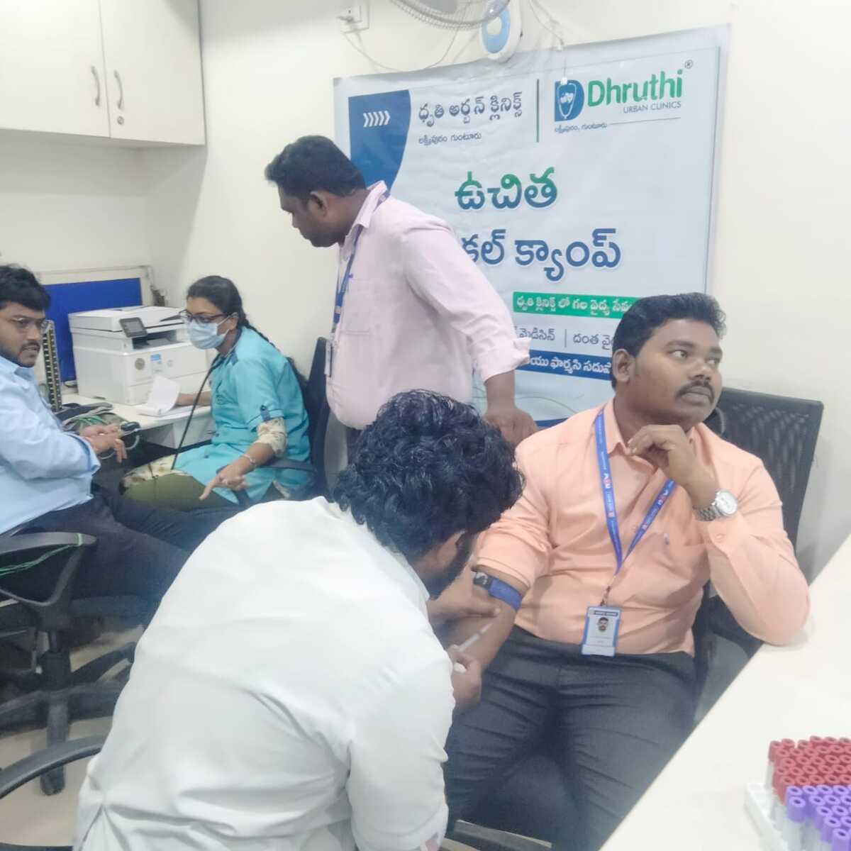 Today, ie.,12th Dec’23 Dhruthi Urban Clinics conducted Free Medical Camp at HDFC BANK lakshmipuram, Main Road, Guntur. In this camp BP, RBS, CBP, Blood Grouping, Weight has been examined & made Dental Screening also to all the Bank Staff Members.