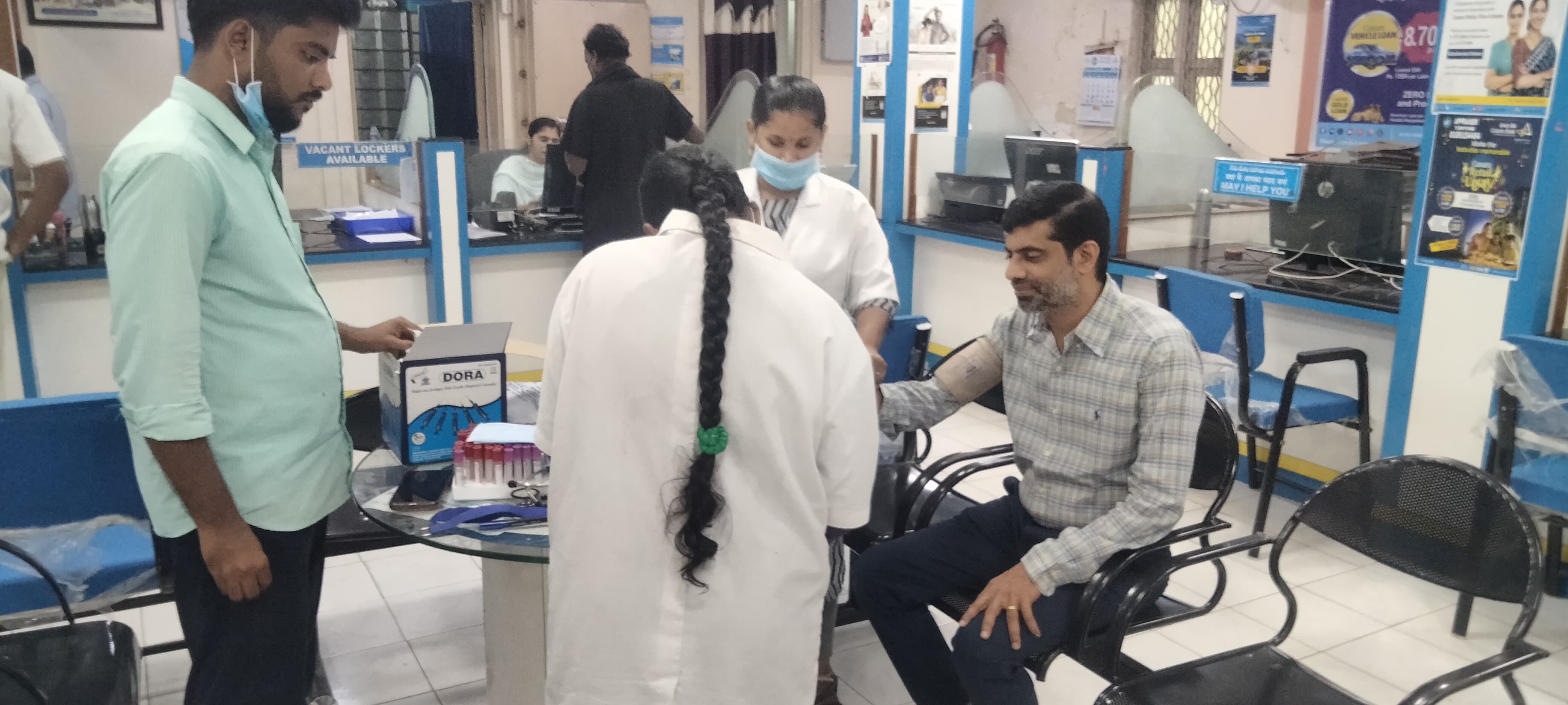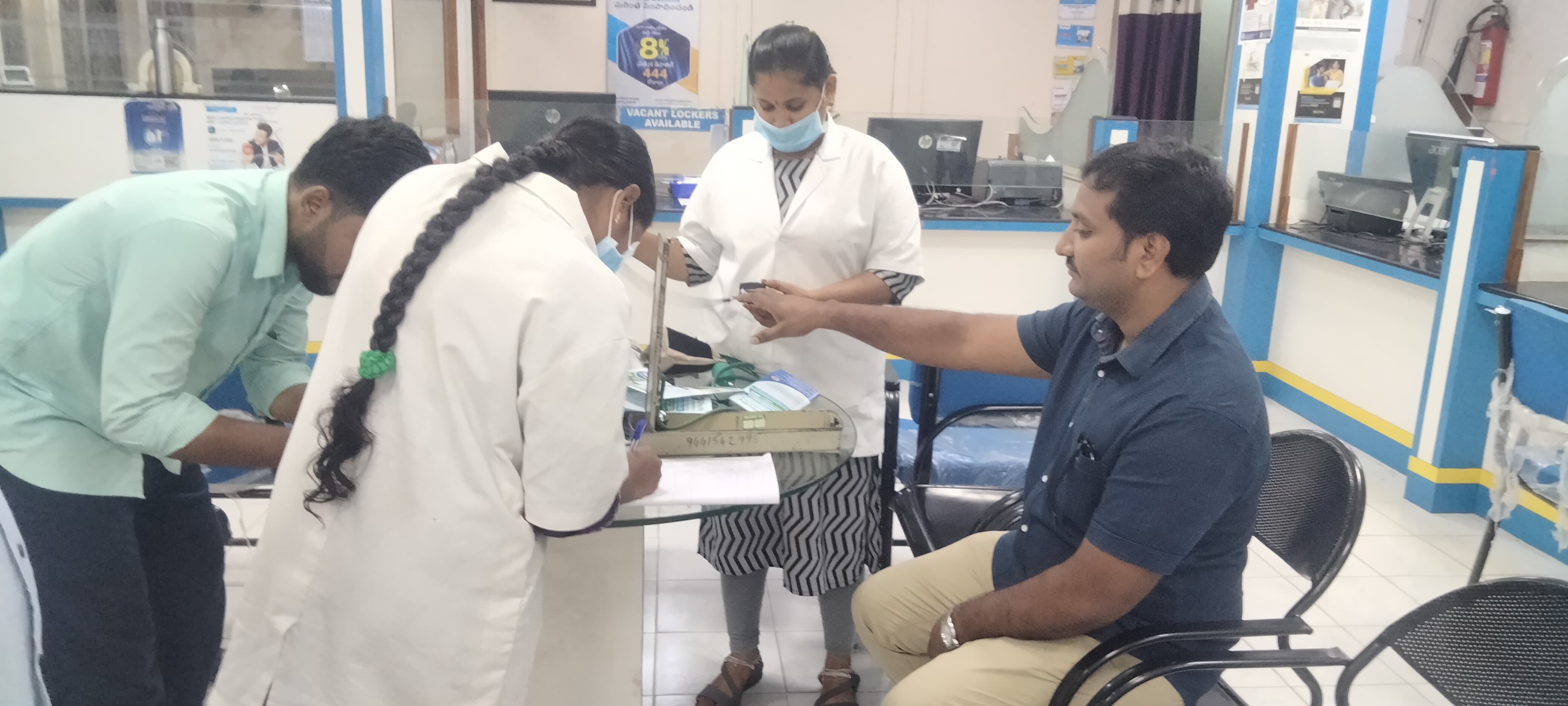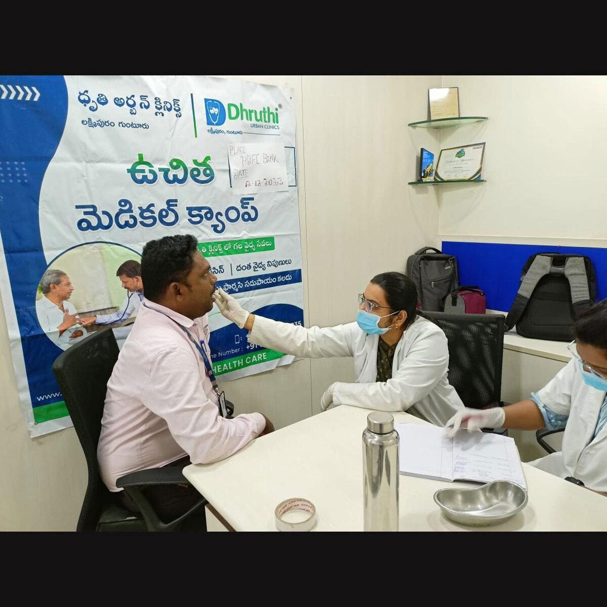 Today, ie.,12th Dec’23 Dhruthi Urban Clinics conducted Free Medical Camp at HDFC BANK lakshmipuram, Main Road, Guntur. In this camp BP, RBS, CBP, Blood Grouping, Weight has been examined & made Dental Screening also to all the Bank Staff Members.