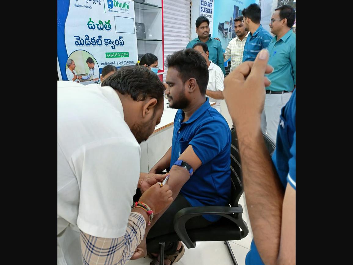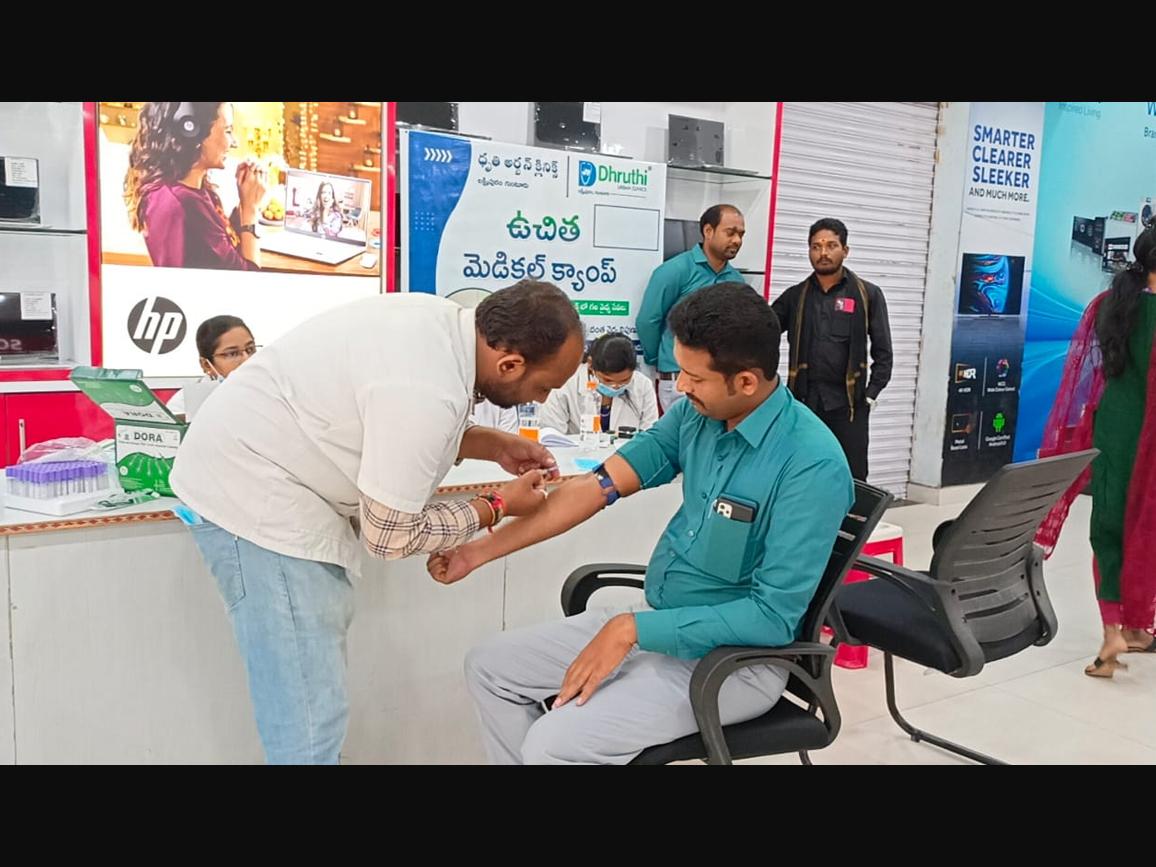 Today i.e.,11th May' 24 (Saturday) Dhruthi Clinic conducted Free Medical Camp at kanchipuram Varamahalakshmi Silk Showroom lakshmipuram, Guntur. In this camp Dental screening,Weight, BP, RBS, CBP,Blood grouping has been examined to all the Staff Members
